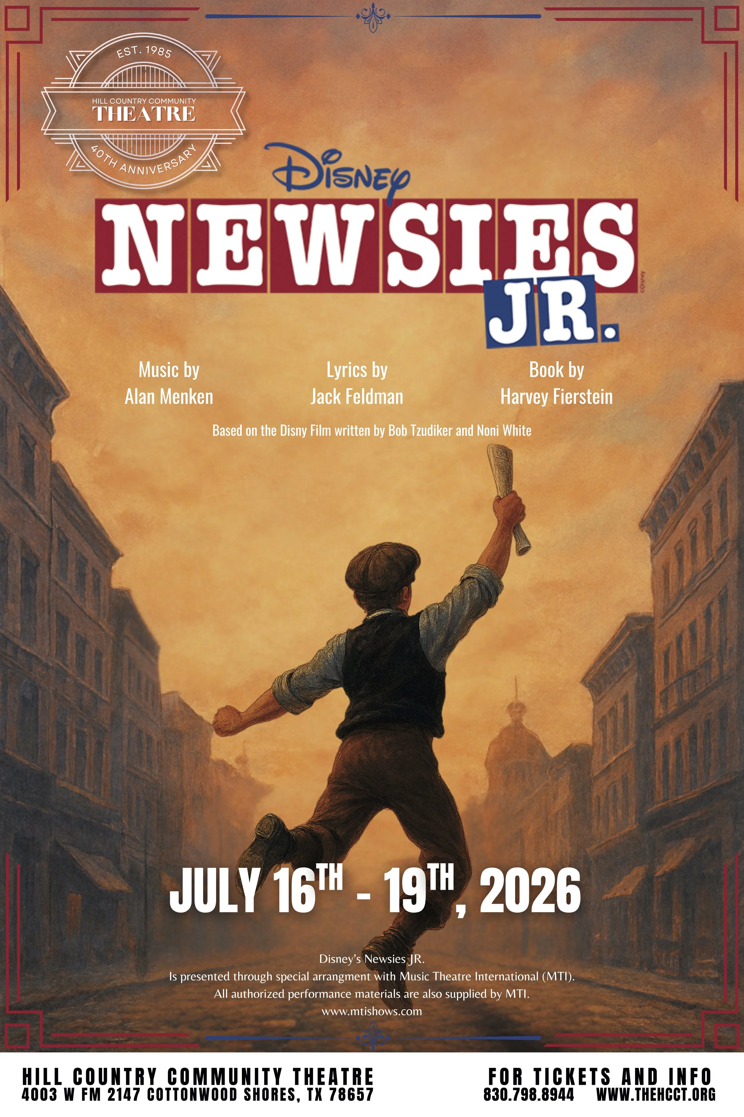 Join us for an unforgettable theatrical adventure at Hill Country Community Theatre’s Summer Youth Theatre Camp, running July 6th–19th, 2026! Designed for students ages 8–17, this two-week camp meets Monday through Friday from 10:00 AM to 4:30 PM and is led by the dynamic directing duo, Jordan and Christine Jones. Campers will build confidence, creativity, and collaboration skills as they rehearse, explore character development, and bring a full musical production of Disney's Newsies Jr. to life—all culminating in four public performances.